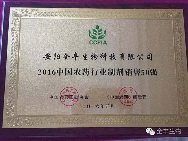 安陽(yáng)全豐生物科技有限公司以“誠潤田園、豐達天下”為崇高使命,“全心服務(wù)、豐收萬(wàn)家”為不懈追求。始終堅持質(zhì)量第一、服務(wù)第一的理念,榮獲中國制劑銷(xiāo)售50強企業(yè),榜單排名第三十七位!