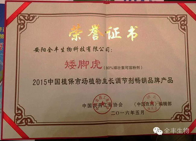 同時(shí),安陽(yáng)全豐“矮腳虎?” 榮獲2015年中國植保市場(chǎng)植物生長(cháng)調節劑暢銷(xiāo)品牌產(chǎn)品!